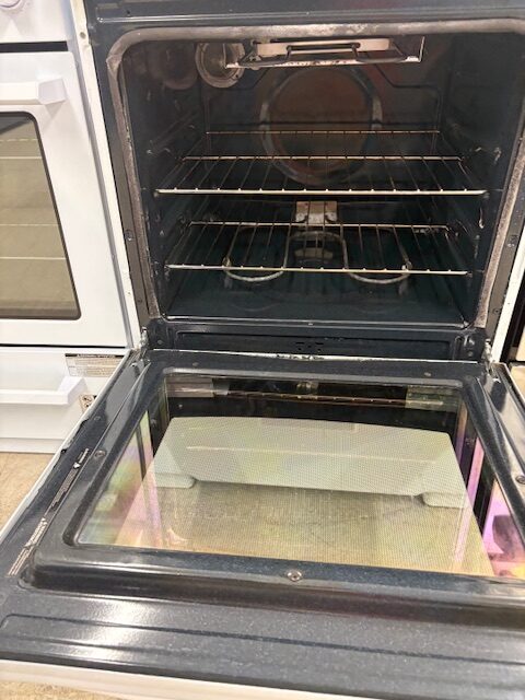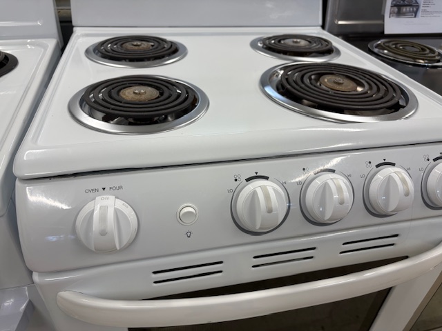 Reconditioned Stove, Electric, white in colour, 24″ Width, Coil Top, 4 Burners (Safety limiter elements), Accessible knobs (Front of stove), 2.9 cu. ft. Capacity, Storage Drawer, 1 Oven