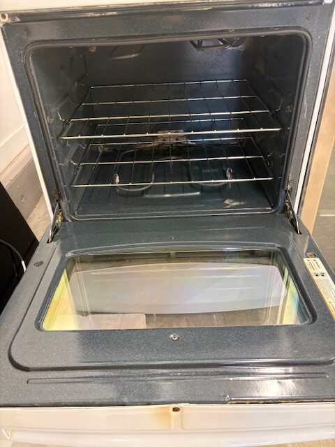 Reconditioned Stove, Electric, white in colour, 24″ Width, Coil Top, 4 Burners, Accessible knobs (Front of stove), 3 cu. ft. Capacity, Storage Drawer, 1 Oven