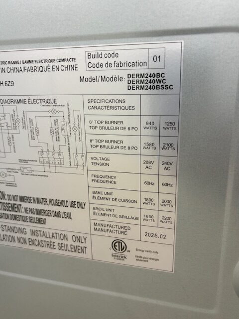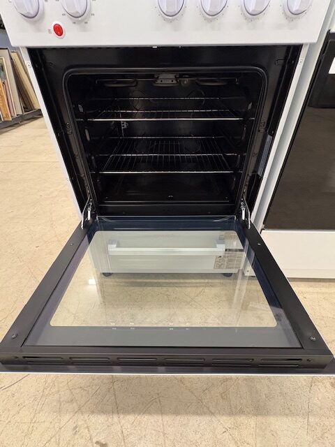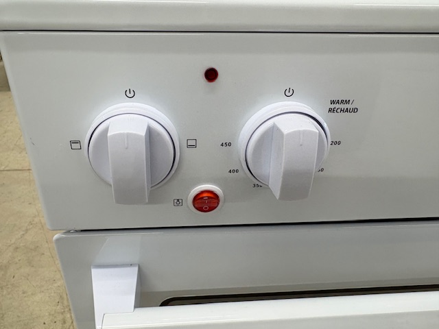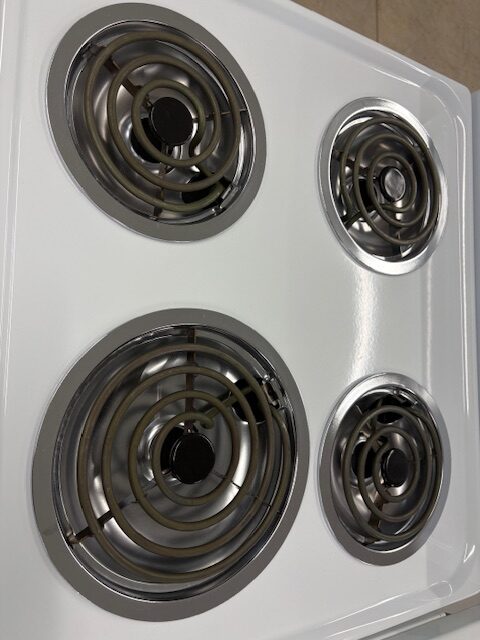 Reconditioned Stove, LIKE NEW CONDITION, Electric, white in colour, 24″ Width, Coil Top, 4 Burners, Accessible knobs (Front of stove), 2.5 cu. ft. Capacity, Storage Drawer, 1 Oven