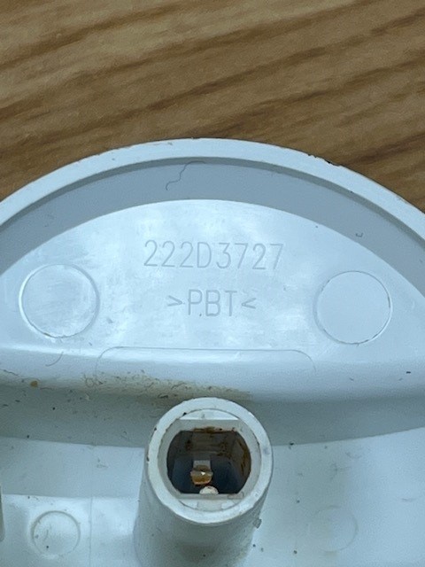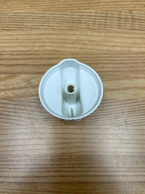 This control knob is white in colour with grey details. The knob turns the burner control that powers the heat of the surface burner on your range.