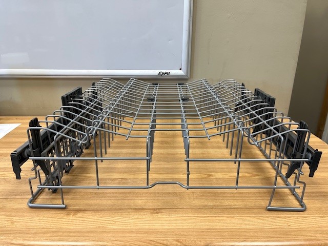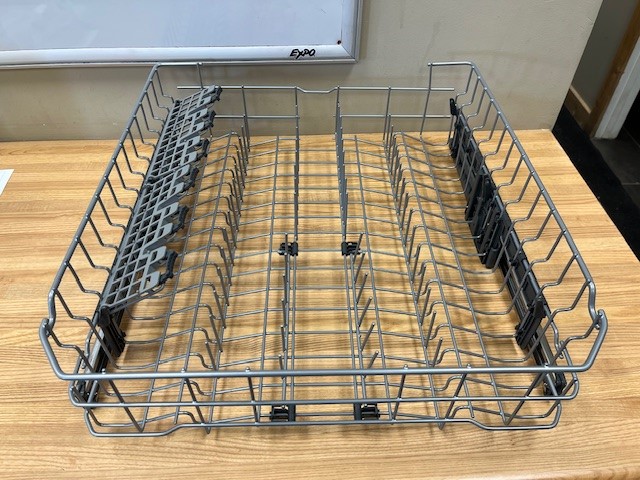 Light Grey in color. This is the Center Rack in the dishwasher that contains 3 racks. This rack is being sold with the following parts: partitions, partition clip, rails, and shelf cup attachments