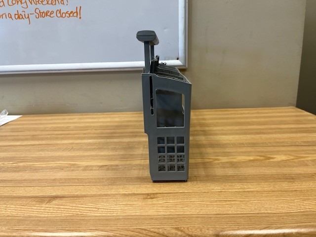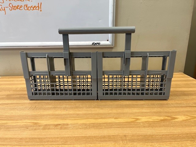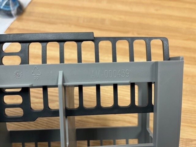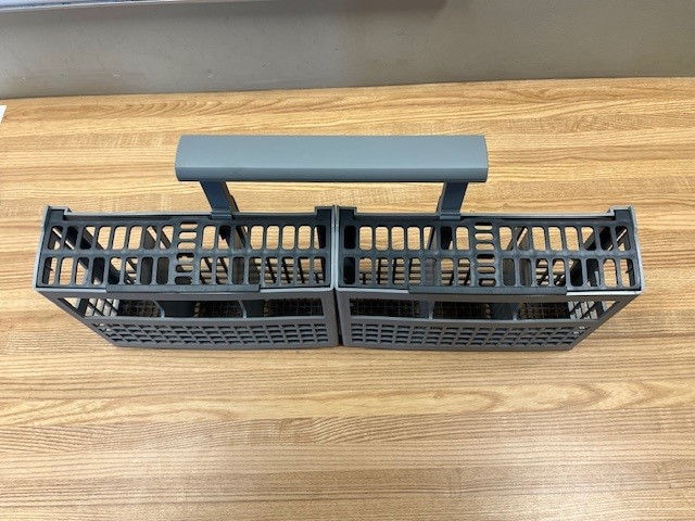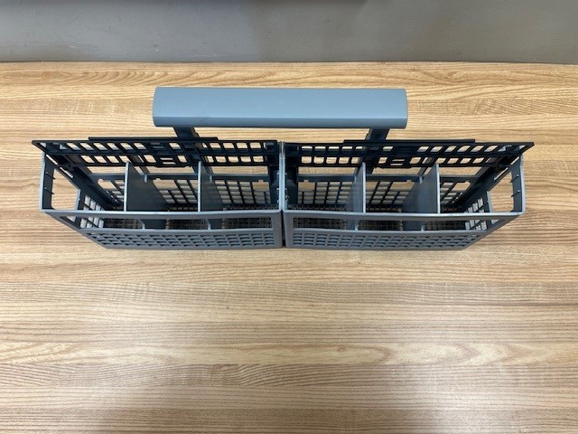 Light Grey in color. This part is also known as a silverware basket. Sits in the Lower Dishrack and holds utensils for washing.