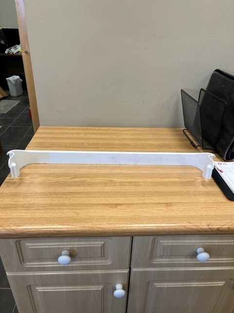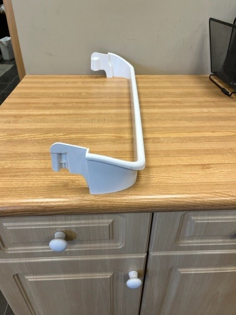 Frigidaire genuine refrigerator Door Shelf Bar. This door shelf bar is white in colour. The door rack attaches to the inside of the refrigerator door, providing space for small items, such as condiments. This part is also known as a bottle bar or retainer bar. This would be a Center door bar for an 18 cu.ft. Fridge (30 Inch wide Fridge). The Bar width is approx. 25″ wide.