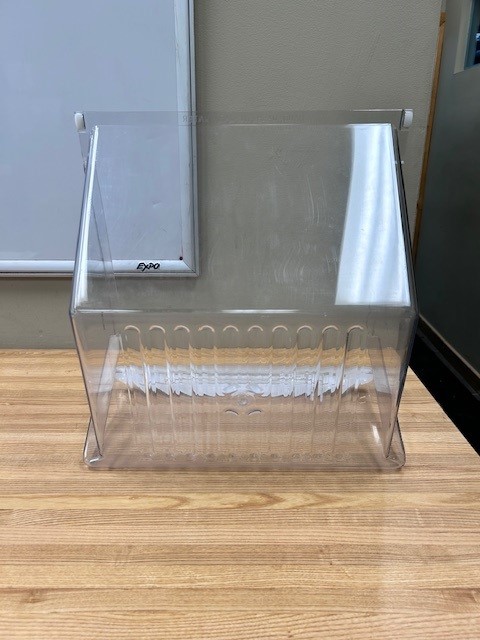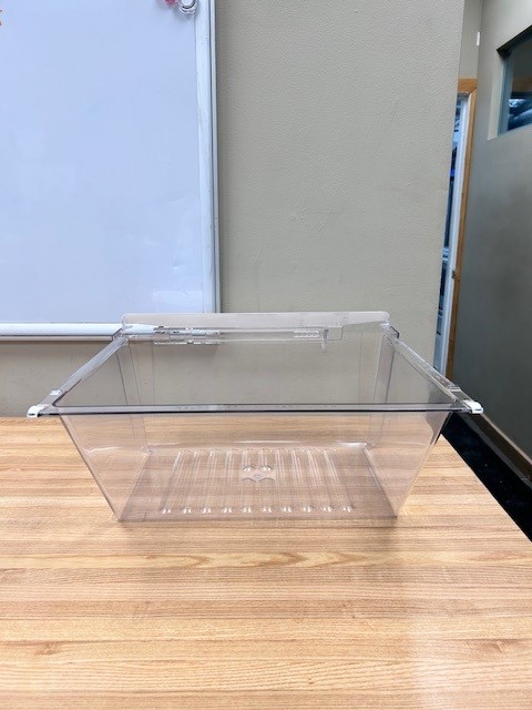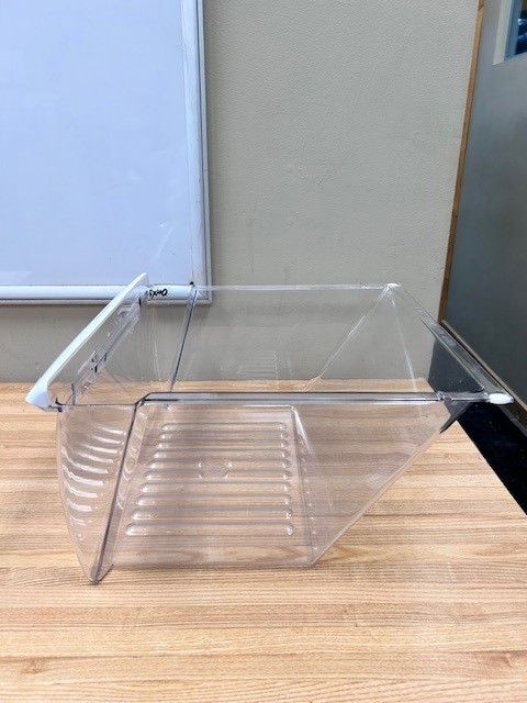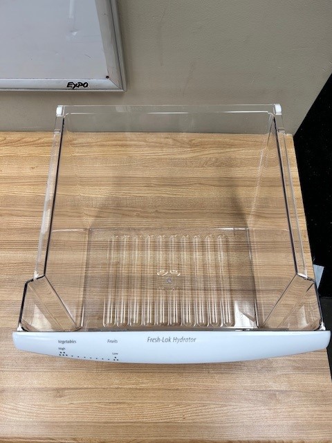 The Crisper drawer is a Large drawer in fridge compartment that is used to store vegetables and Fruit. This particular Crisper Drawer is found in the lower position on the Fridge side of a Side x Side Fridge. Clear crisper drawer with a white trim at the top front of the bin. Fresh-lok Hydrator on the bin. Includes the Humidity Control lever P# 240362201.