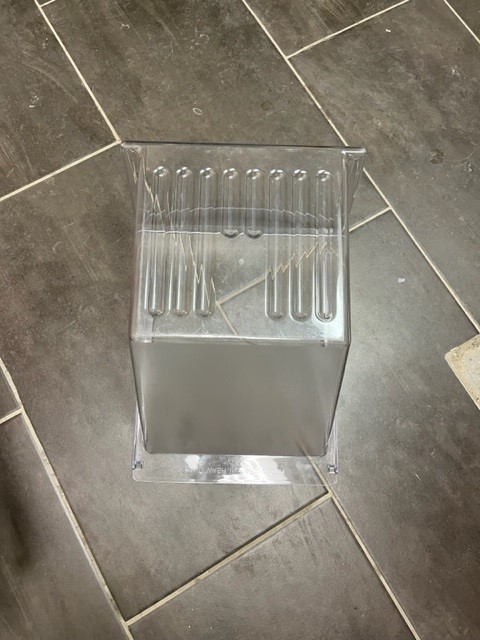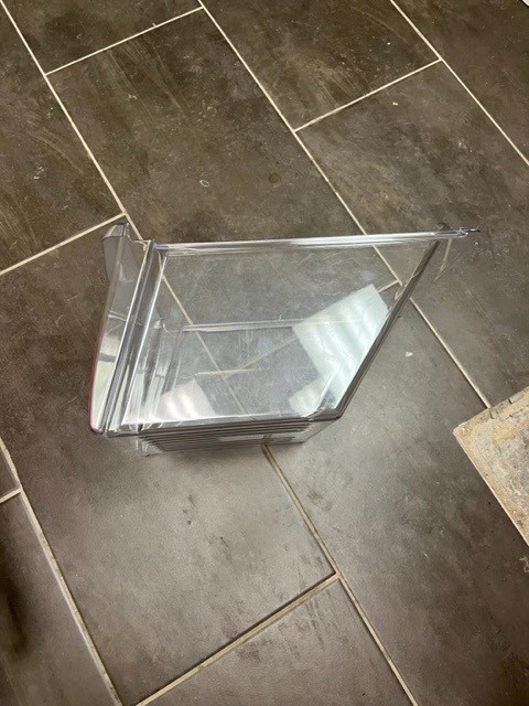 This crisper drawer is clear in colour. The crisper drawer stores fruits and vegetables. This crisper drawer is found in fridges which are 15, 16, or 17 cuft that are 28″ wide.