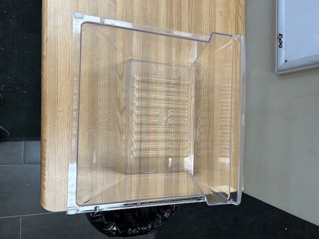 The Crisper drawer is a Large drawer in fridge compartment that is used to store vegetables and Fruit. This particular Crisper Drawer is found in the lower position on the Fridge side of a Side x Side Fridge. Clear crisper drawer.