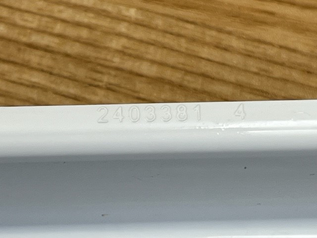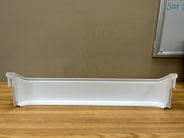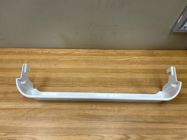 This door shelf bar is white in colour. The door shelf trim snaps into place on the door to hold items on the door shelf. This door bar is normally found in the Fridge section of a 18-20 cu.ft. fridge.