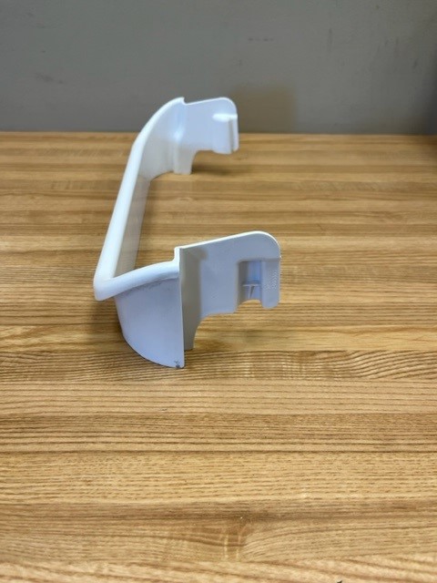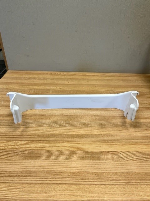 This door shelf bar is white in colour. The door rack attaches to the inside of the refrigerator door, providing space for small items, such as condiments. This part is also known as a bottle bar or retainer bar.