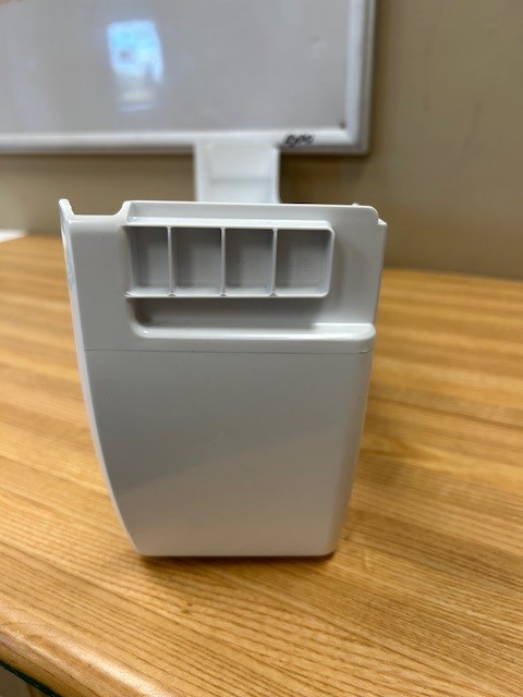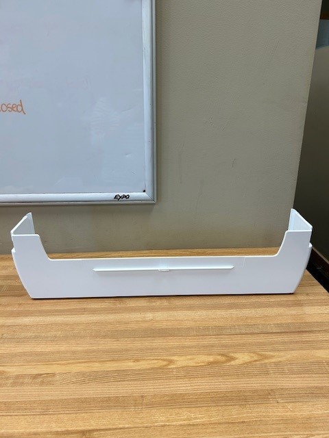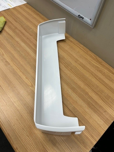 This door shelf bar is white in colour. The door shelf trim snaps into place on the door to hold items on the door shelf.