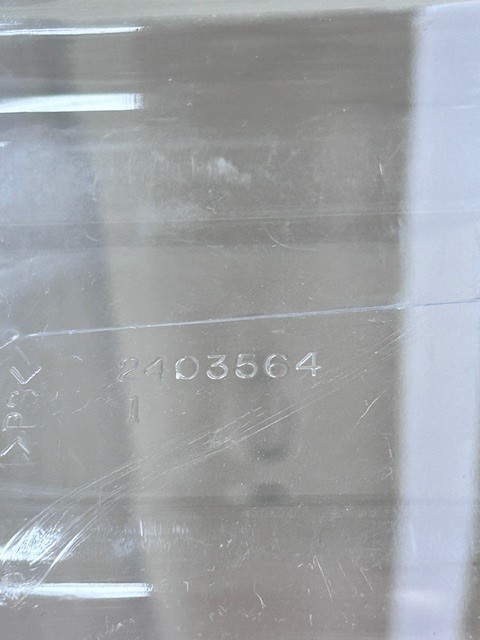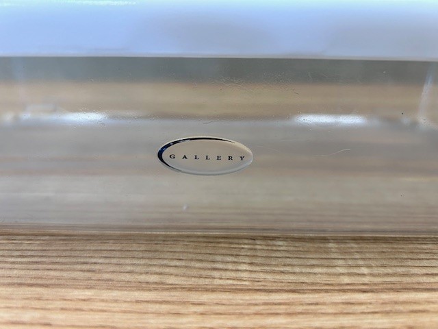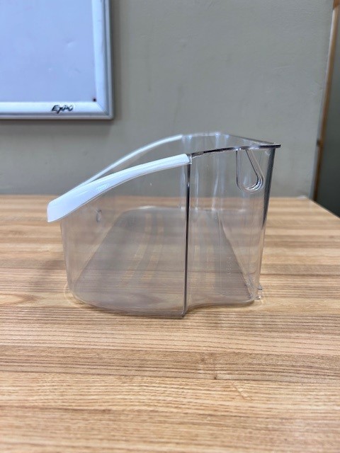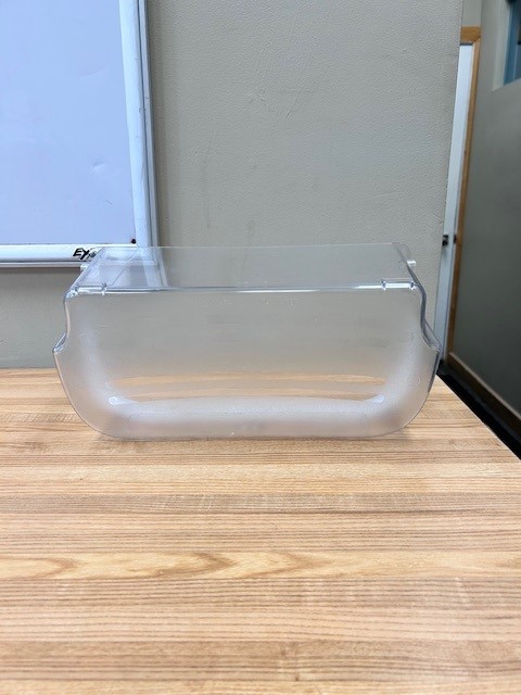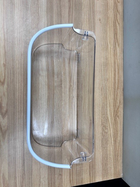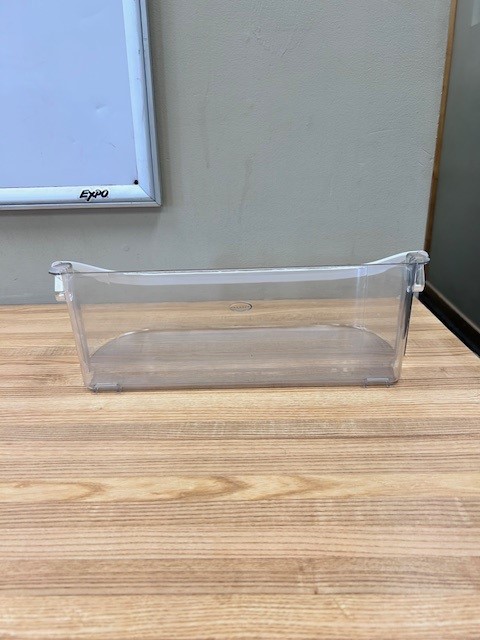 This door bin is clear in colour. Current replacement parts are a clear, this bin has a white trim along the top front of the bin and a “Gallery” sticker front and center on the bin. Found on the Fridge side door of a side by side refrigerator.  Width 15 3/8″ Depth 7″ Height 5″