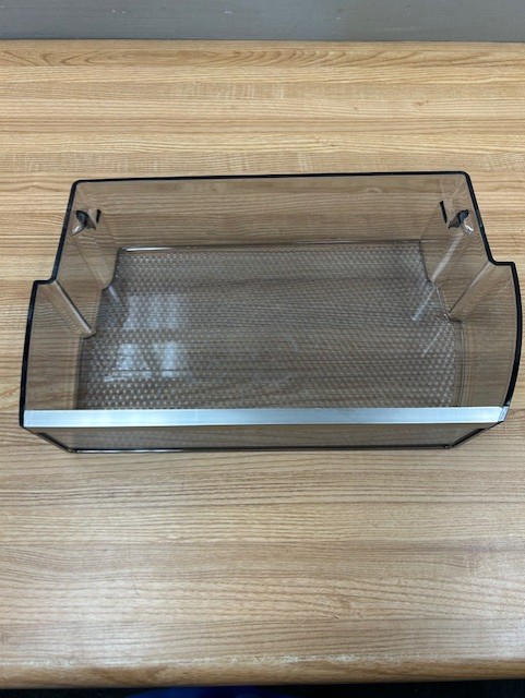 This plastic bin is gray/clear in color with a silver trim. The door bin attaches to the inside of the refrigerator door and typically holds jars and bottles. This bin is typically found on a French door Fridge on the right Door.