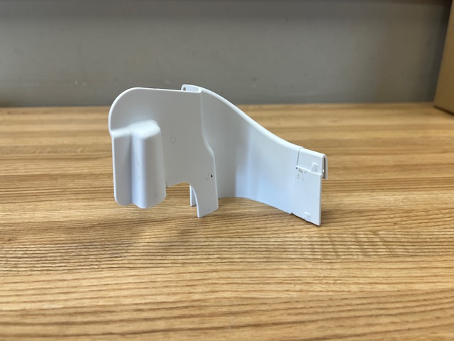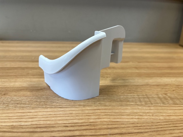 Description: This is the right hand end cap for the 2 litre door shelf bar. This part is white in colour. This door shelf rail end cap snaps into place on the door to attach the door shelf rail to the inner door liner.