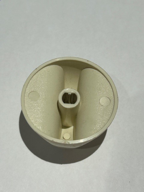 This control knob is Off-white (almond) in colour with grey details. The knob turns the burner control that powers the heat of the surface burner on your range.