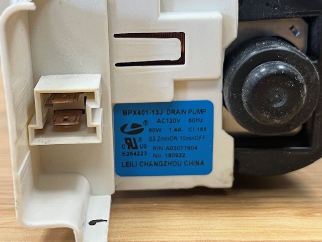 The drain pump removes water from the washer during the drain portion of the cycle. This pump uses 60 Hz, 80 watts and 120 volts.