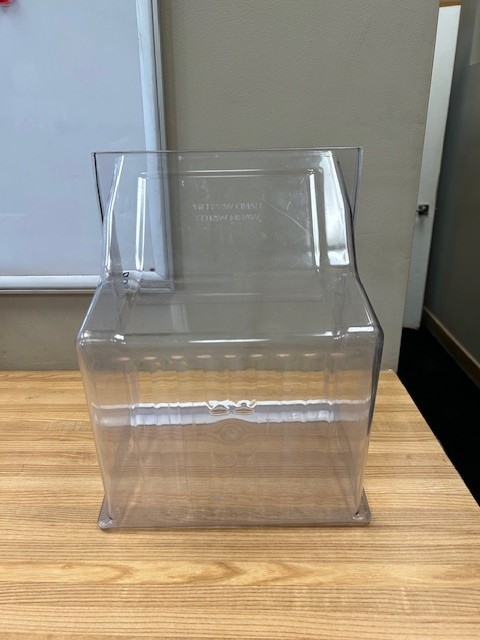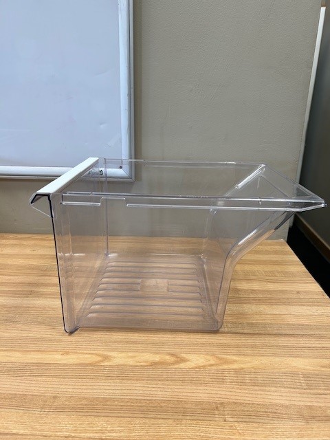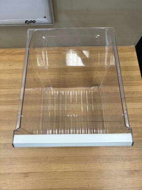This crisper drawer is clear in colour with a White Trim. The crisper drawer stores fruits and vegetables.