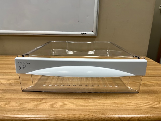 The drawer is a compartment that attaches to on the of the Glass Shelves in the Fridge. This particular Drawer is found in the upper position on the Fridge side of a Side x Side Fridge.