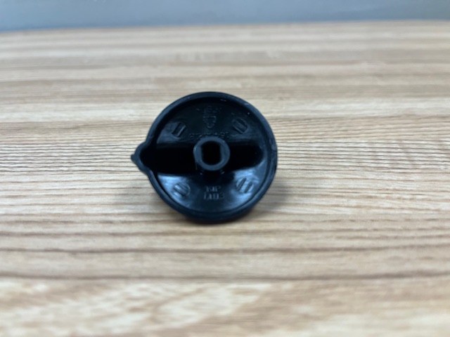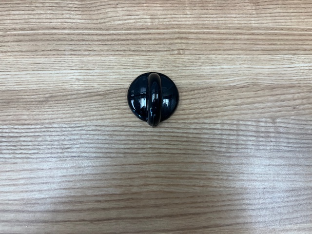 This control knob is plastic and black in color. The knob turns the burner control that powers and allows you to control the heat of the surface burner on your range.