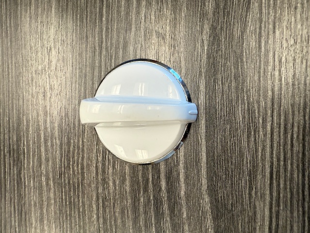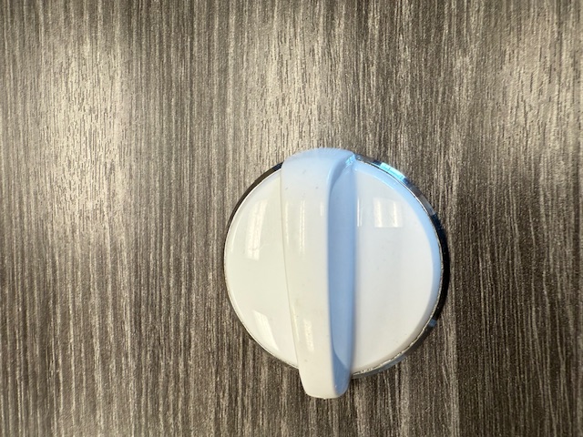 This control knob is white in color with silver details. The burner control knob controls the heat of the surface burner on your range.