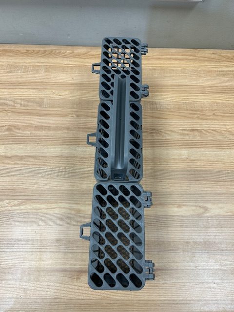 Light Grey in color. This part is also known as a silverware basket. Sits in the Lower Dishrack and holds utensils for washing.