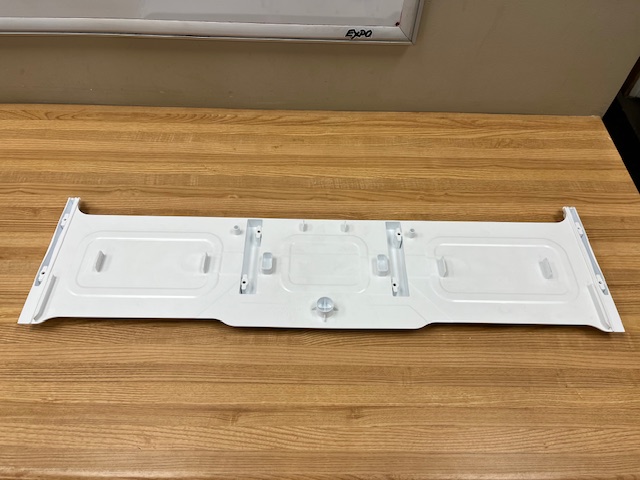 This is the Bottom of the Crisper Assembly. The crisper bottom when completed with all parts holds the Crisper drawer in place. Color is White, Made of Plastic.
