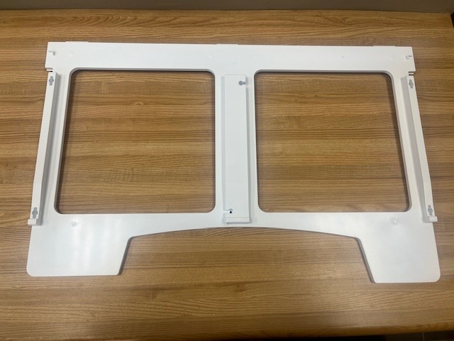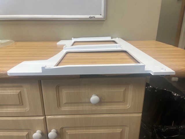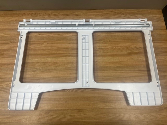 This is the Bottom Piece of the Crisper Drawer Frame, that holds the Crispers in place in the Fridge. The Frame when completed with all parts holds the Crisper drawer in place. Color is White, Made of Plastic.