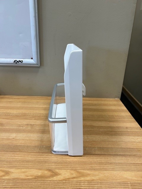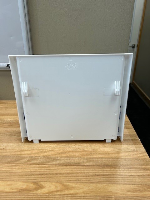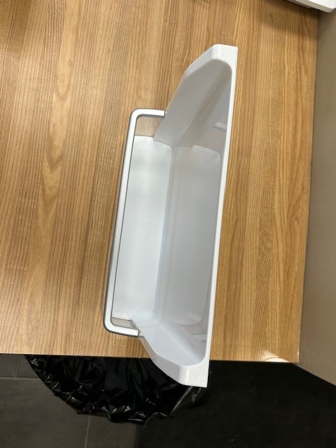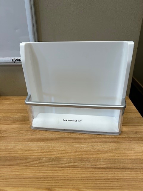 Description: Fridge door bin, normally found on left door of a 33″ French door fridge at the Bottom of the Left Door. White bin with a Clear front and a Silver Trim.