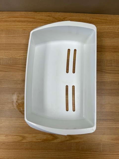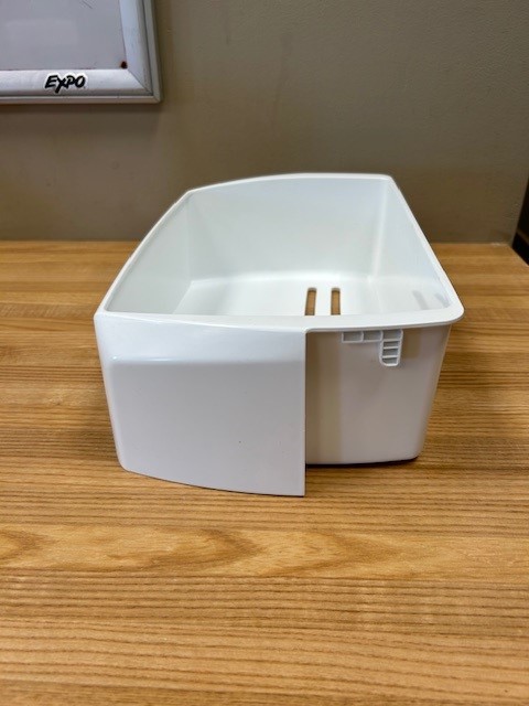 Refrigerator Door Bin. White Plastic Bin that attaches to the right side door of the Fridge and used to store Milk/Condiments. Bin may or may not contain the Text “Gallon Storage Bin”.