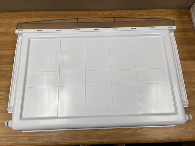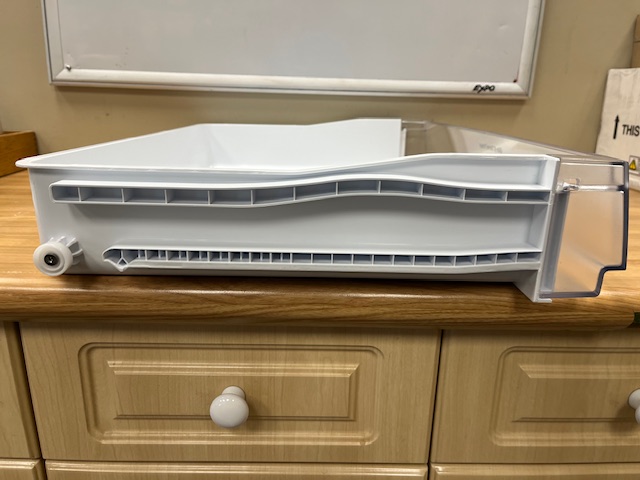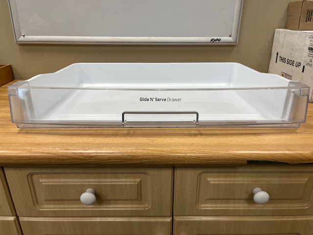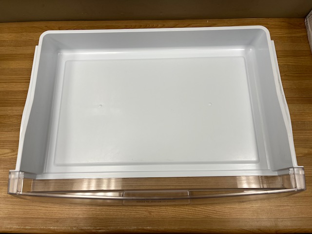 White Large pantry Drawer with Clear front found at the bottom of the fridge section of the French Door Fridge. Also known as  Large Deli Drawer or Glide N’ Serve Drawer.