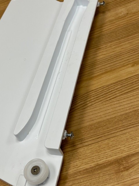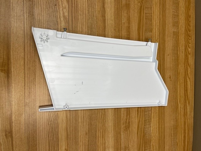 This is the Left side Slide rail that attaches to the Crisper Frame top (P#ACQ86594202 – sold separately) and Bottom (P# MCK67482601 – sold separately). Part comes with the Roller Wheel and the 2 screws that are used to attach the rail to the bottom frame. The Frame when completed with all parts holds the Crisper drawer in place.