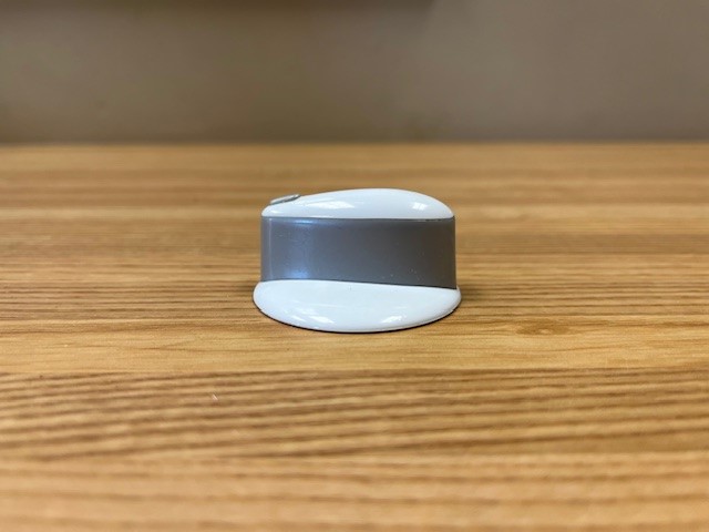 This control knob is white in colour with grey details. The knob turns the burner control that powers the heat of the surface burner on your range.
