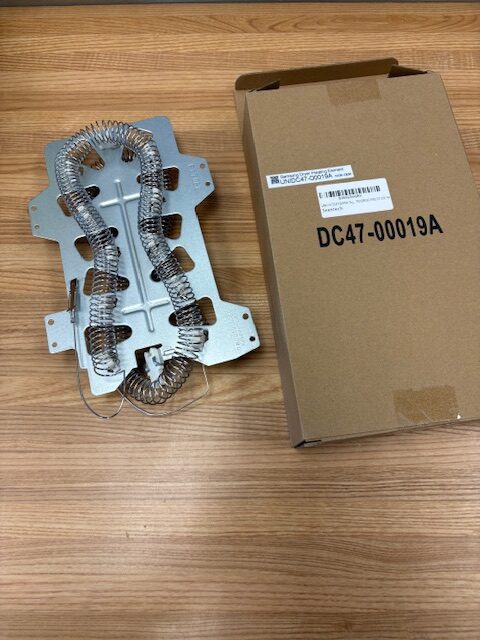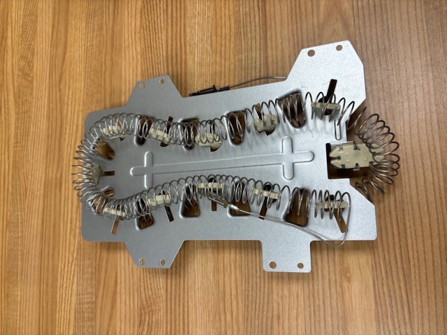 The heating element assembly includes the housing with the heating element coil and insulators attached. The heating element generates the heat for drying the clothes.