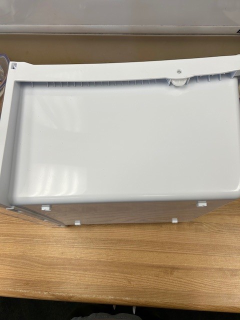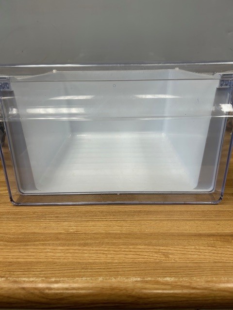 Description: This crisper drawer is white with a clear Front. The crisper drawer stores fruits and vegetables at a humidity level that helps keep them fresh longer.