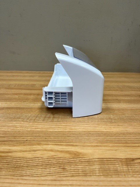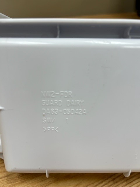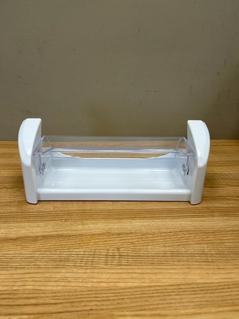 Refrigerator Door Bin with clear Dairy Door, which moves open and closed. White with Clear front. Found in 30″ French door Fridge about 21-22 cu.ft. in capacity.