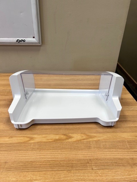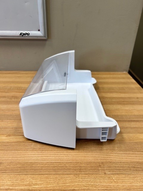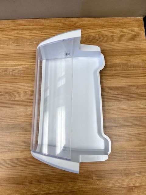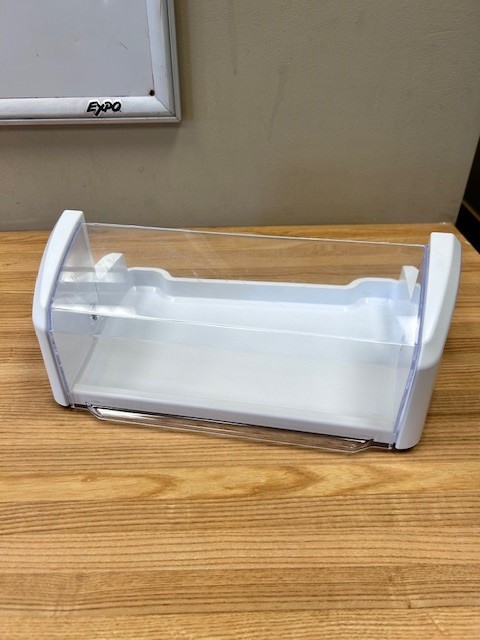 Refrigerator Door Bin with clear Dairy Door, which moves open and closed. White with Clear front. Found in French door Fridge on the right door.