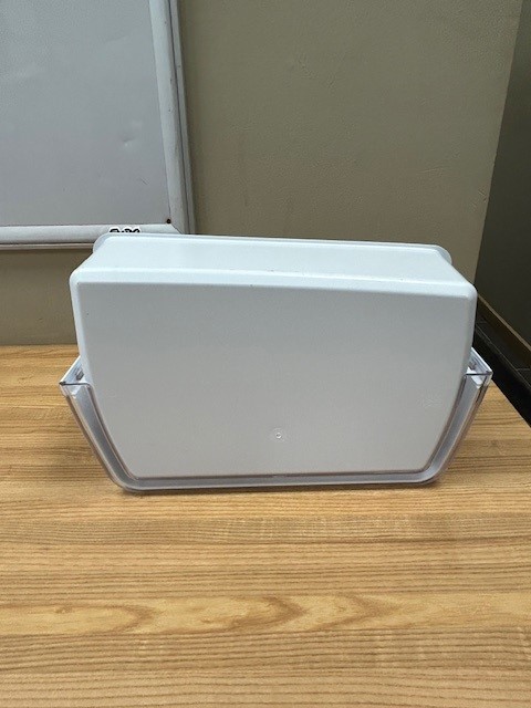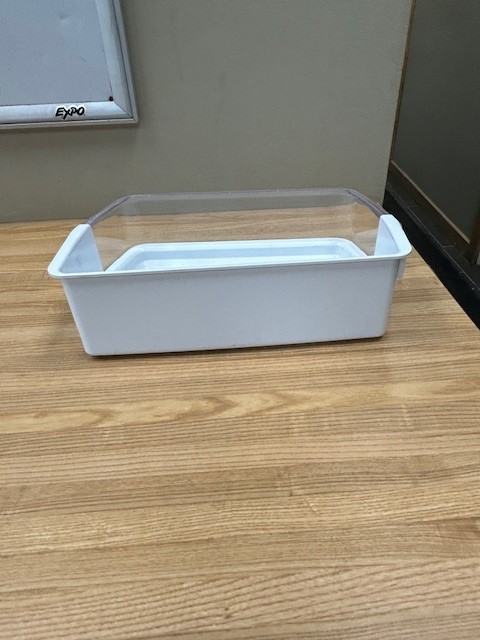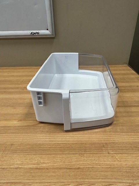 Refrigerator Large Door Bin. White in color with Clear Front. Door bin found in a French door fridge on the Right Hand door.