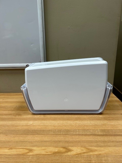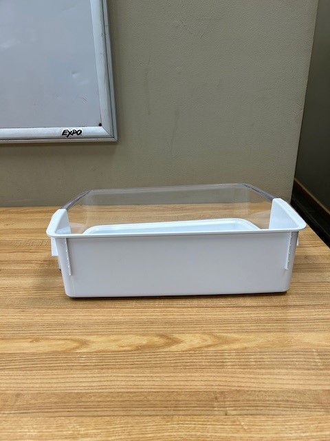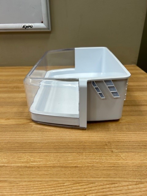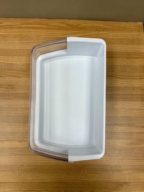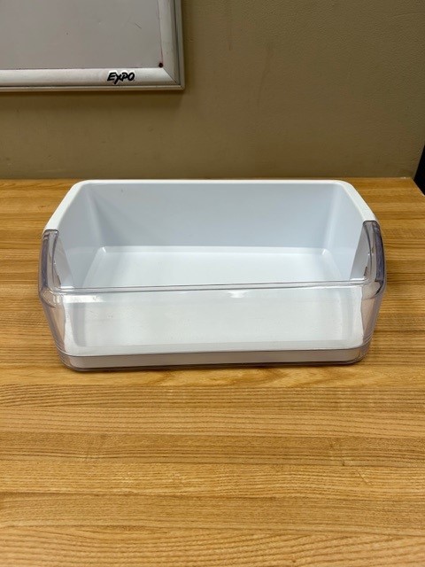 Description: Refrigerator Large Door Bin. White in color with Clear Front. Door bin found in a French door fridge on the Left Hand door.