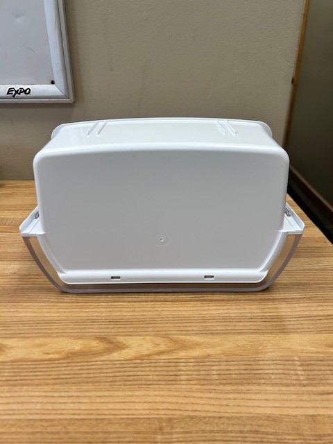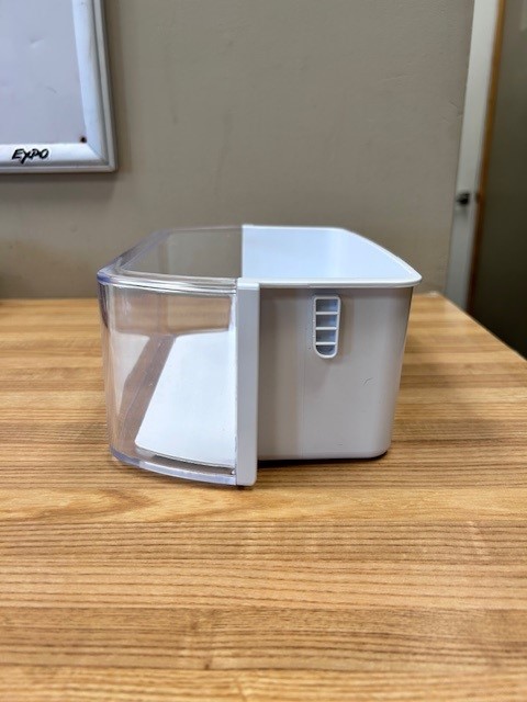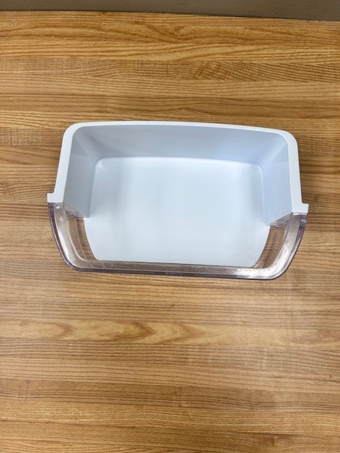 Refrigerator Door Bin. White in color with Clear Front. Door bin found in a 30″ French door fridge.