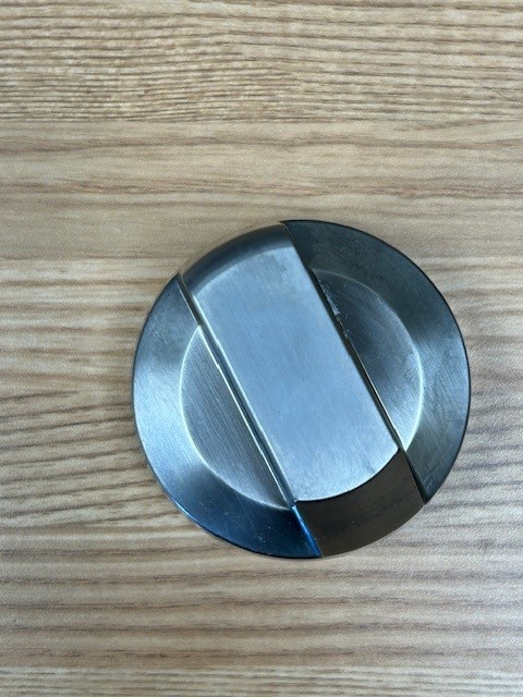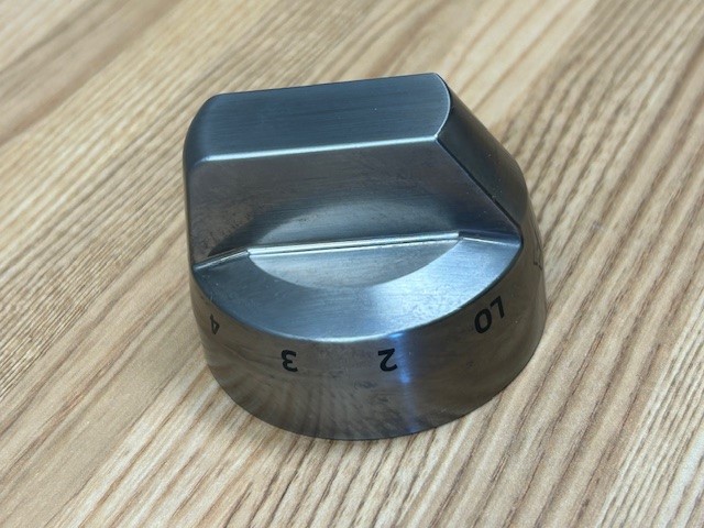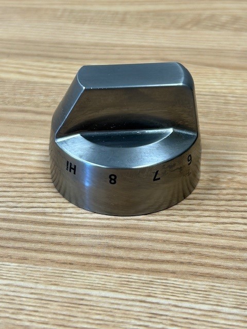 This control knob is Stainless in colour and is made of Metal. The knob turns the burner control that powers the heat of the Single element on your range. These Knobs are found on a Black Stainless Steel Slide in range.