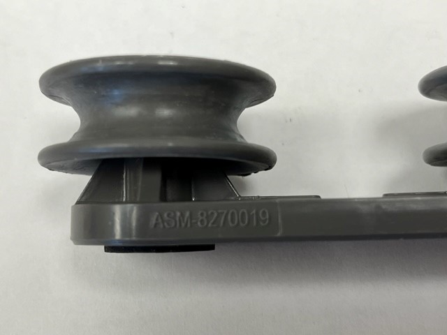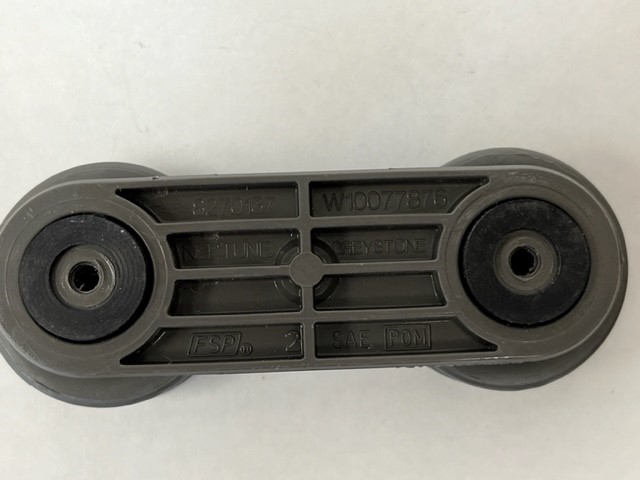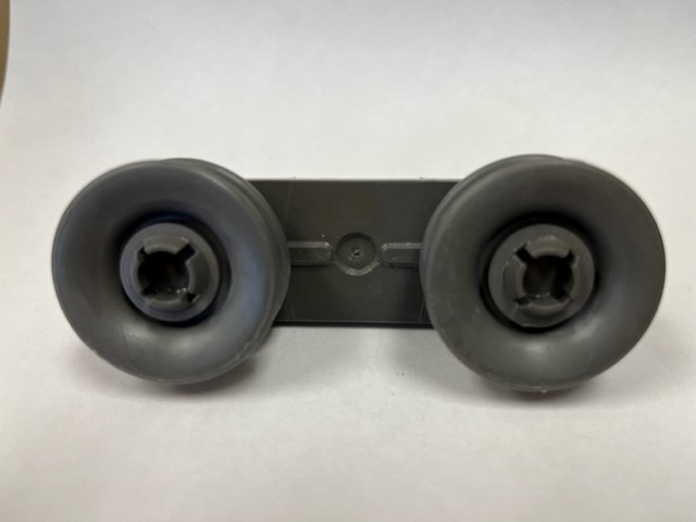 Dark Grey in color.  Dimensions (Approx.)- Width: 3 3/4″   Length:  1 1/2″   Height:  1″ . This part is also known as a rack roller, dishrack wheel, or dishrack roller. The tub roller attaches near the top of a side wall in the tub to the track to allow the upper dish rack to slide.