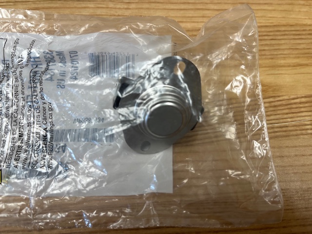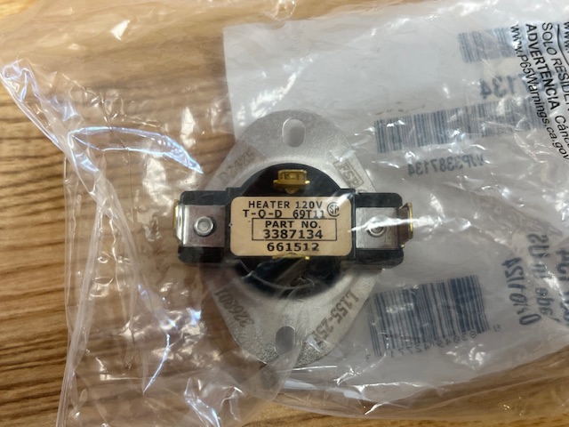 This thermostat has a limit of 155°F. It will turn the heating element back on when the temperature drops by 25°F. This thermostat has 4 terminals. The cycling thermostat monitors and regulates the temperature inside the dryer.