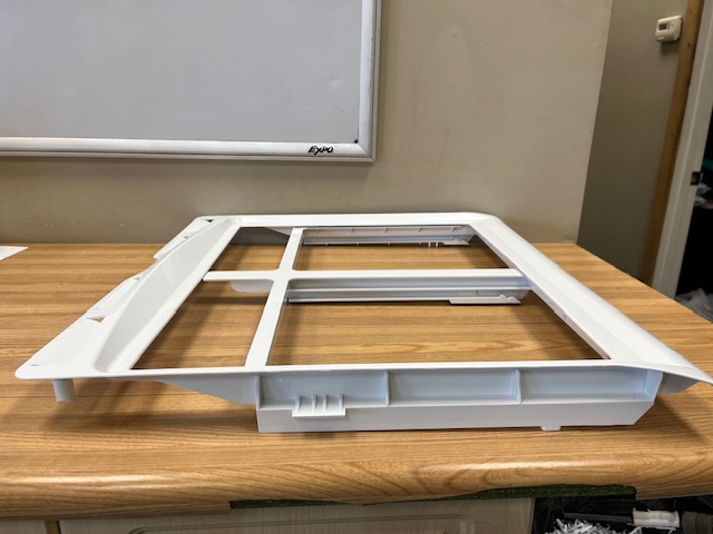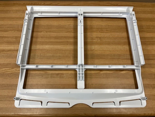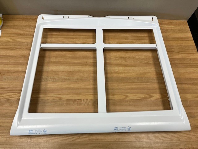 This is the frame that is above the Crisper Drawer in an Refrigerator. The Cover will support the Crisper Drawers. The Frame is Plastic and is white in color.