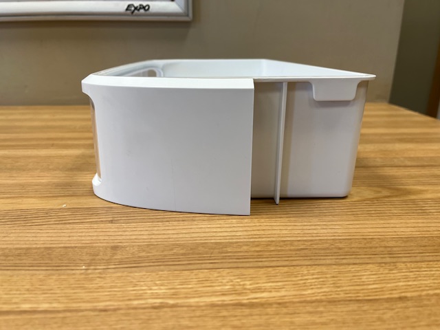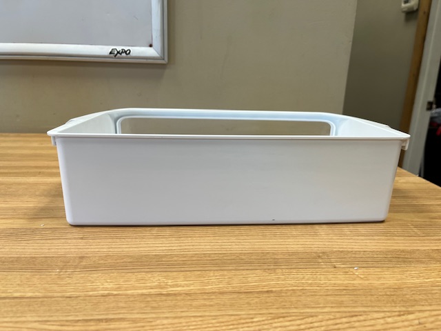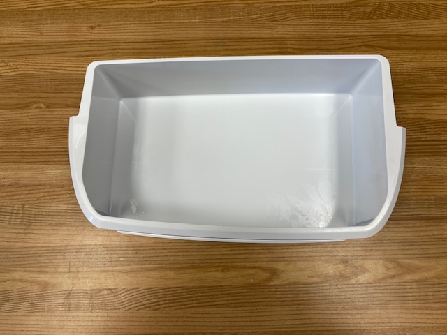 This part is white with a plastic clear window at front. The door bin attaches to the inside of the refrigerator door and typically holds jars and bottles. This bin is normally found in a 30″ wide fridge.