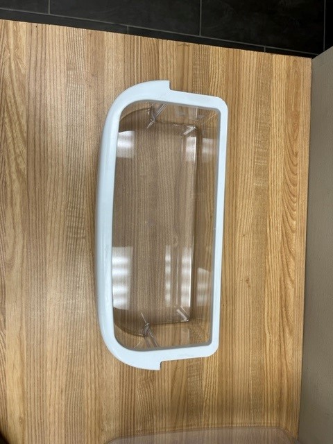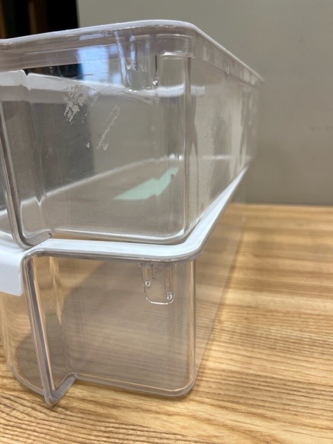 This part is clear with a white trim around the top edge. The door bin attaches to the inside of the refrigerator door and typically holds jars and bottles. This bin is normally found in a 30″ wide fridge. Note for this part that there are slightly different variations to plastic attachment that holds the bin on the Fridge door. These pieces will work the same even if they look slightly different. See picture for the differences, they are the same part numbers. If you have a preference for one over the other, please note it with your order and we will try – if available to accommodate.