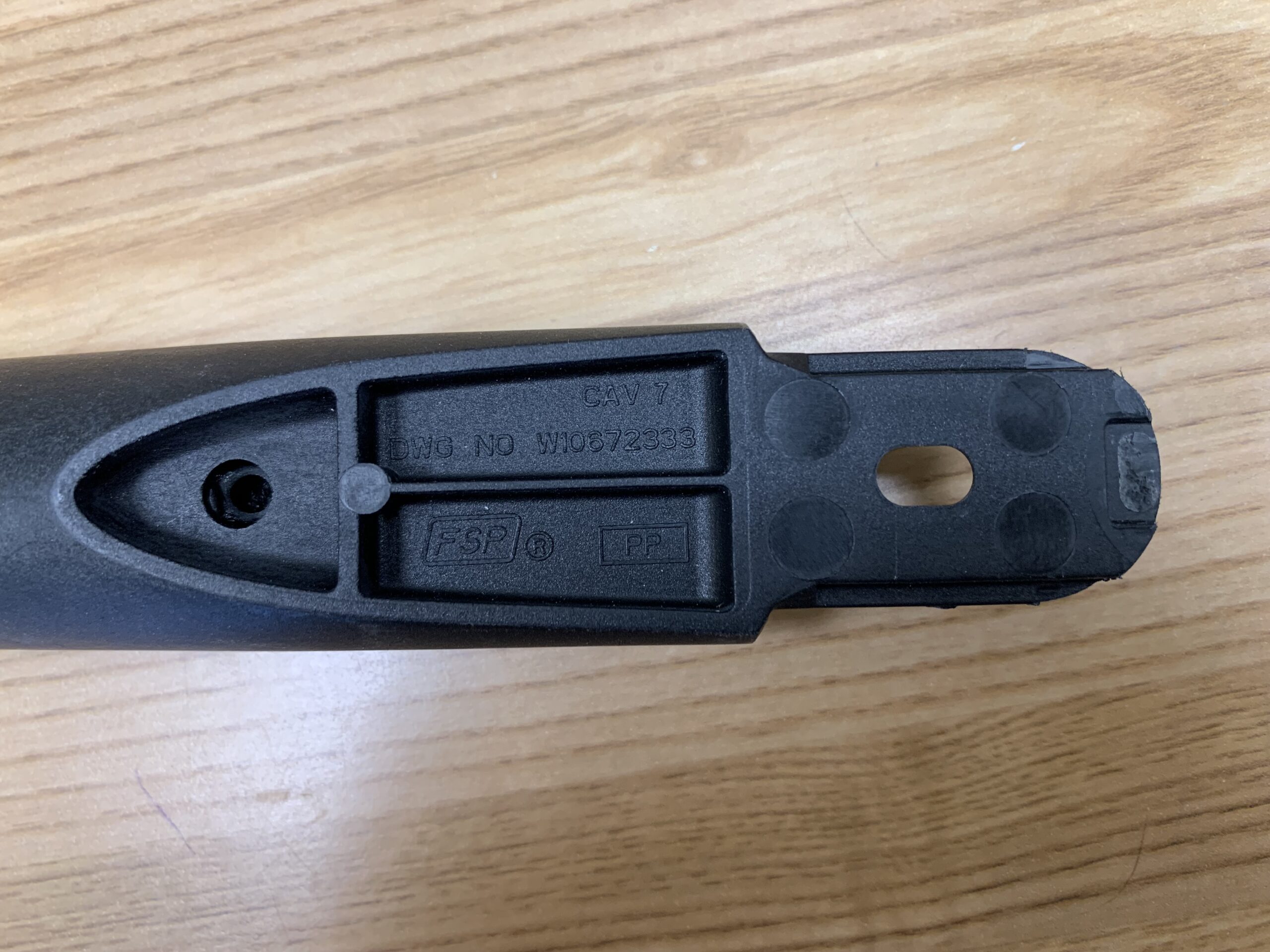This is a Plastic Handle, Black in colour. Doesn’t come with the handle screws. This handle doesn’t include the Plastic Cap that covers the screws (See part W10672338). The handle will work for both the Fridge and Freezer.
