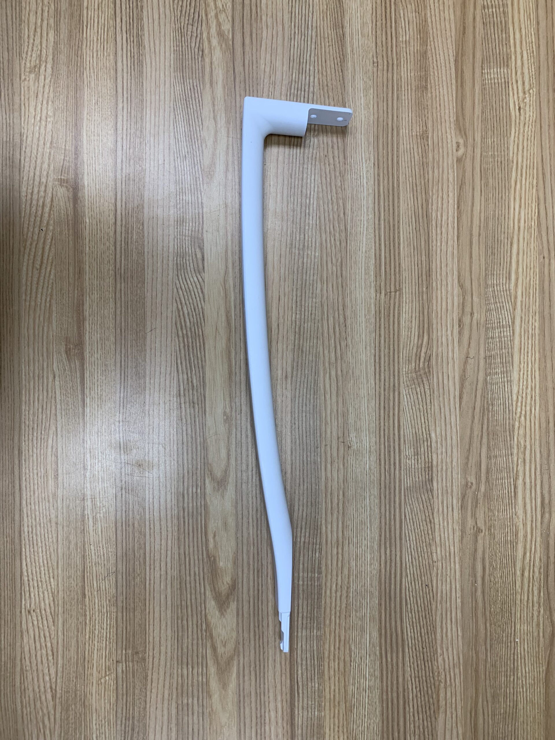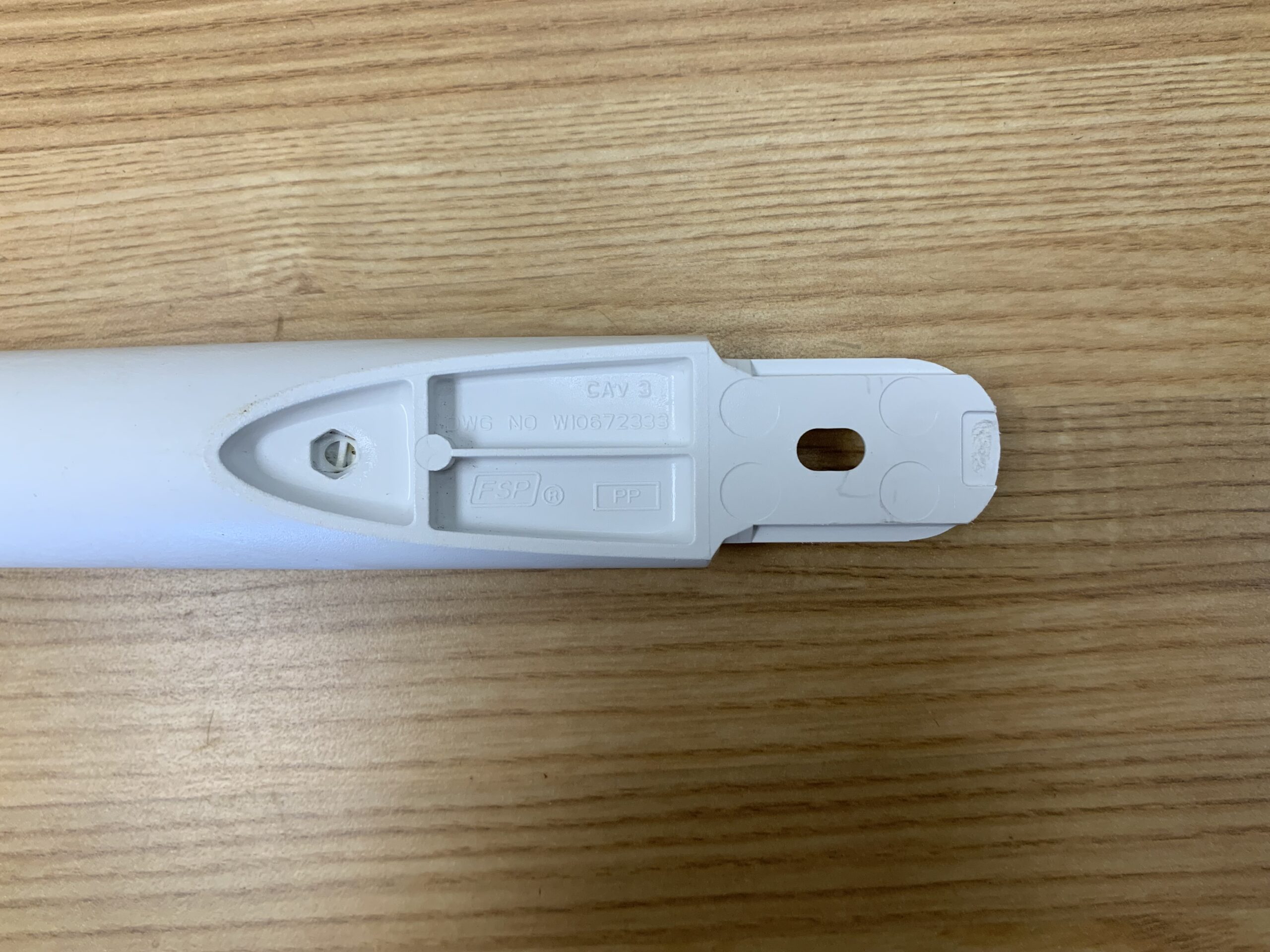 This is a Plastic Handle, white in colour. Doesn’t come with the handle screws. This handle doesn’t include the Plastic Cap that covers the screws (See part W10672338). The handle will work for both the Fridge and Freezer.