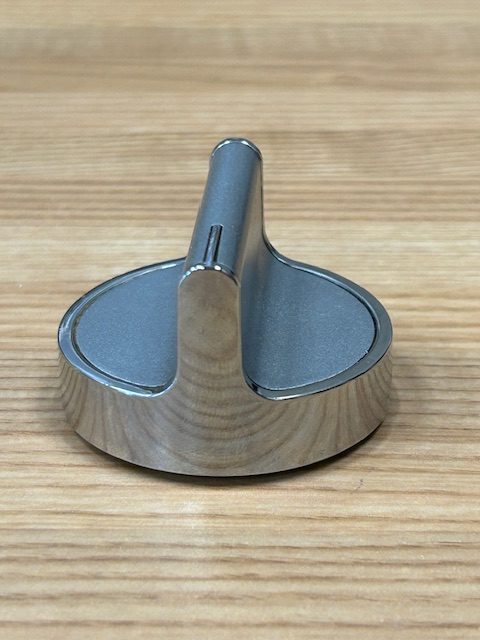 This control knob is made of metal and is silver in color. The knob turns the burner control that powers the heat of the surface burner on your range.